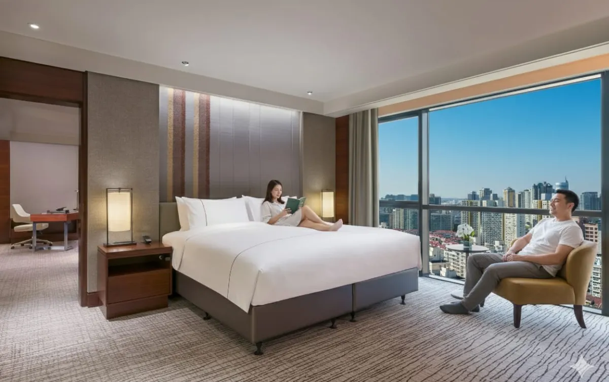 The Amara Premier Suite is an experience of unmatched sophistication. Awake to panoramic views of Shanghai through towering windows, this expansive suite boasts a grand living and dining space, perfect for entertaining or quiet respite. The refined palette of warm tones and modern furnishings create a gentle, inviting ambience to unwind. Guests enjoy exclusive access to the Club Lounge, where bespoke services and premium offerings ensure every moment is tailored to perfection. This is Shanghai living at its most exceptional.